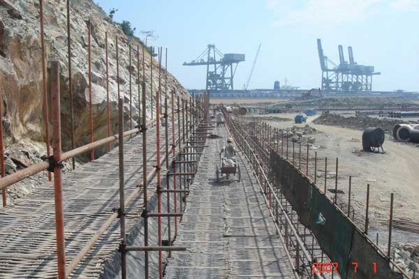 寶鋼馬跡山港工程位于泗礁本島西南1.5km處,本港至上海吳淞口約60海里,距北侖港74海里,從上海港到各大洲的國(guó)際航線均從嵊泗海域經(jīng)過(guò)。馬跡山港圍堤、陸域形成工程所需土石料由馬跡山本地就地開山采取,由寶山鋼鐵(集團(tuán))投資愈4000萬(wàn),我公司承接的寶鋼馬跡山港開山采石工程,自1996年建設(shè)以來(lái),完成開山采石量560萬(wàn)m3,爆破擠淤180萬(wàn)m3,回填港區(qū)場(chǎng)地40萬(wàn)㎡,山體護(hù)坡4萬(wàn)m3,被評(píng)為部級(jí)優(yōu)良工程。